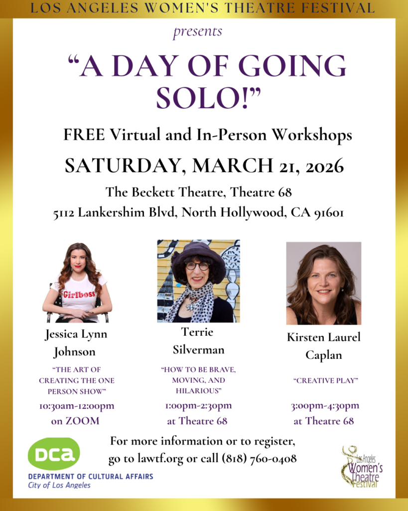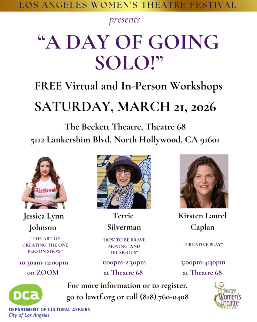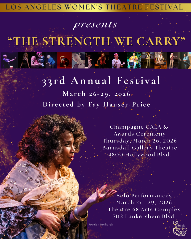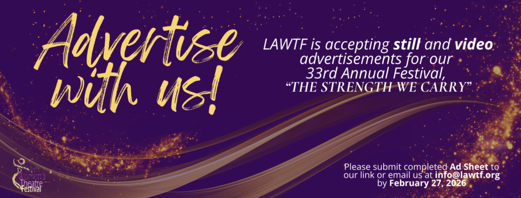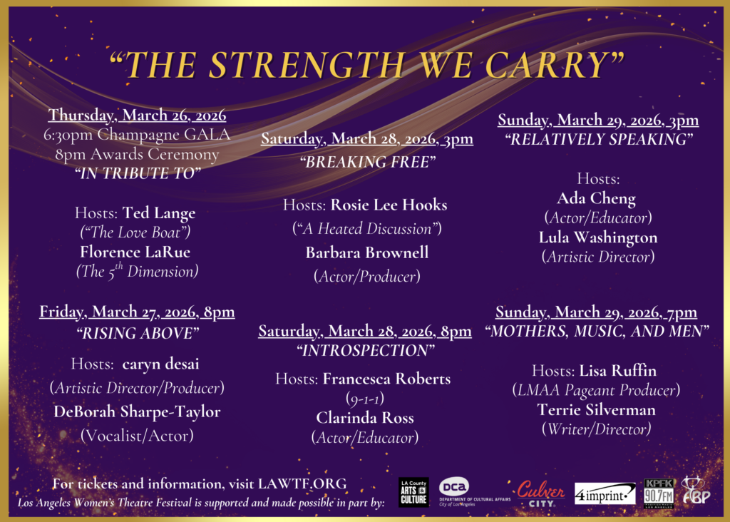 Los Angeles Women’s Theatre Festival organization is supported and made possible in part by: Los Angeles County Department of Arts and Culture, Los Angeles Department of Cultural Affairs, City of Culver City, 4Imprint, KPFK 90.7 FM and Adilah Barnes Productions.
